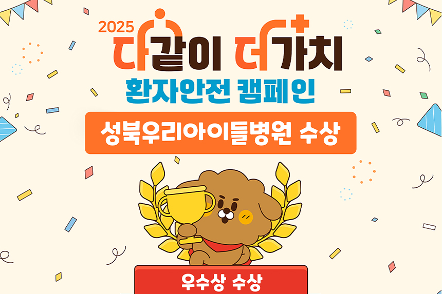 2025 다같이 더가치 환자안전캠페인 성북우리아이들병원 수상 페이지 정보 작성자 관리자 작성일25-11-07 18:30 조회5회 관련링크 다음글 목록 본문 댓글목록 등록된 댓글이 없습니다. 다음글 목록